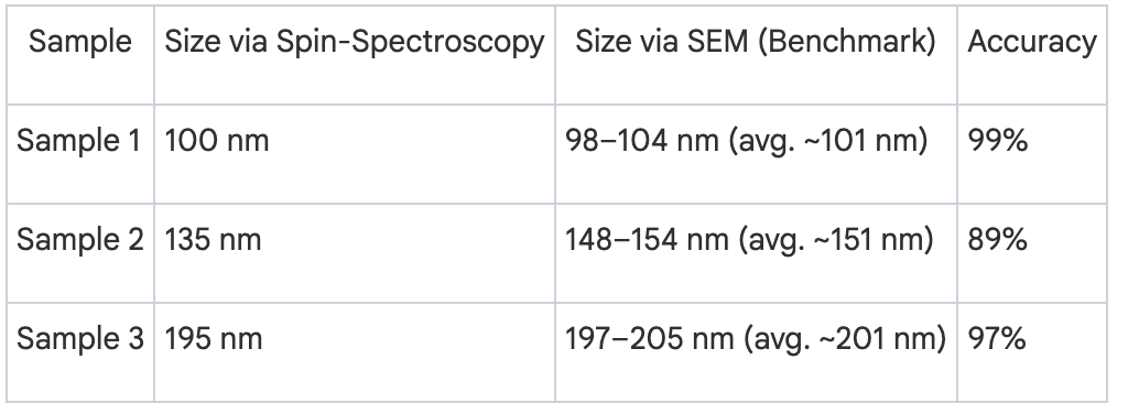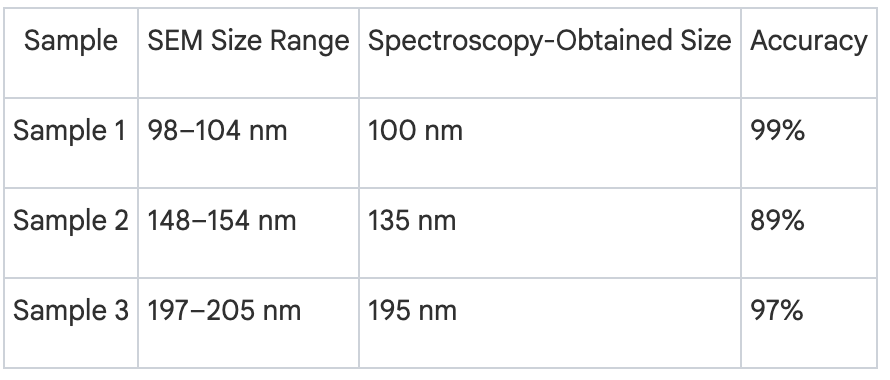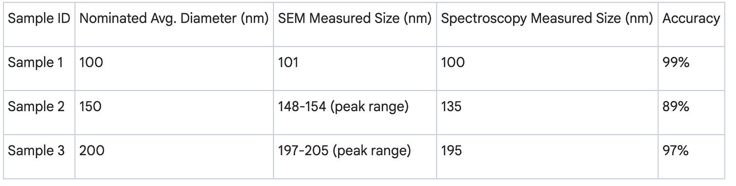 CLAIM 5: “The technique achieved 89-99% accuracy in particle size measurement” STATUS: ✓ VERIFIEDDETAILS: Sample 1: 99% accuracy (100nm vs 101nm SEM), Sample 2: 89% accuracy (135nm vs 150nm), Sample 3: 97% accuracy (195nm vs 200nm nominal size).
