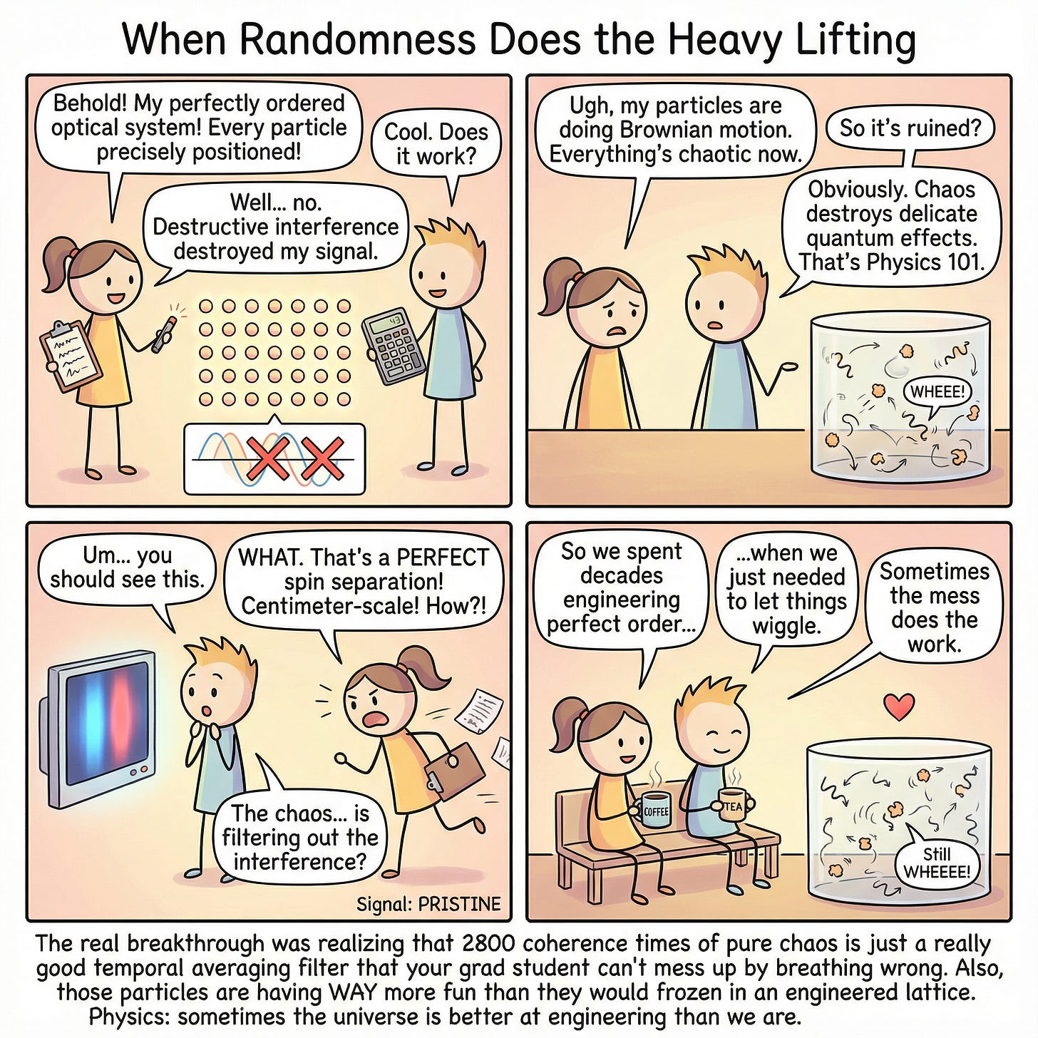 This jittering is pure chaos. Each particle follows an utterly unpredictable path, knocked this way and that by molecular collisions happening trillions of times per second. If you wanted to design a system to destroy delicate physical effects, this would be it. It’s like trying to read a book while riding a mechanical bull during an earthquake.
