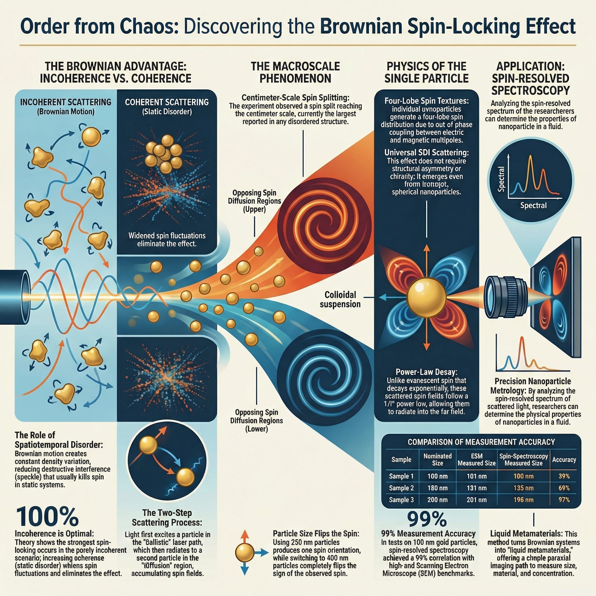 A novel, large-scale optical phenomenon termed the Brownian spin-locking effect (BSLE) has been observed in a spatiotemporally disordered medium. The research demonstrates that when light interacts with a colloidal suspension of nanoparticles undergoing Brownian motion, the scattered light spontaneously separates into two distinct, macroscopic regions of opposite spin (circular polarization). This effect is counter-intuitive, as the high degree of disorder in a Brownian system would typically be expected to randomize and eliminate such delicate spin-dependent phenomena.