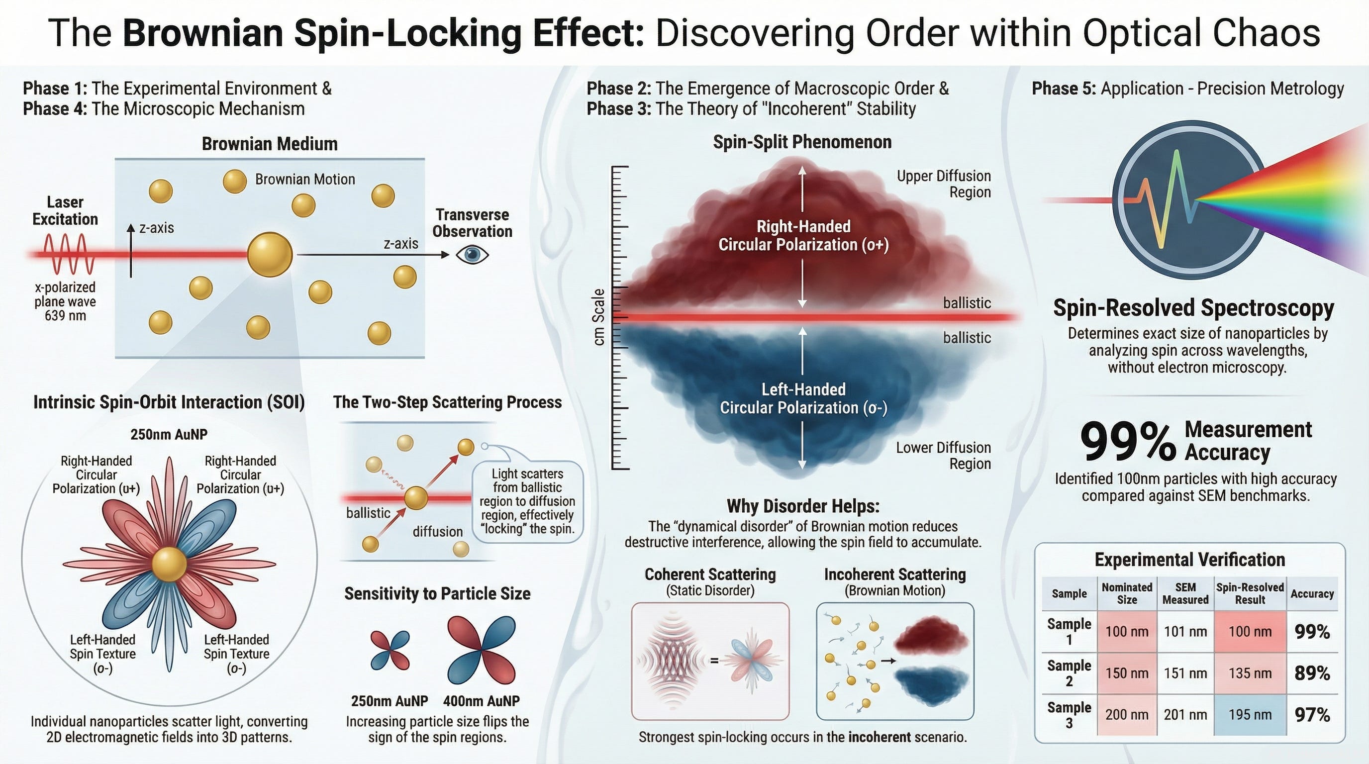 The discovery provides a new experimental platform for exploring macroscale spin behaviors of diffused light. Its significance is demonstrated through a practical application: a spin-resolved optical spectroscopy technique for precision metrology. This method successfully measured the size of gold nanoparticles with high accuracy (up to 99%), showcasing its potential for broad applications in chemistry, biology, and material science.